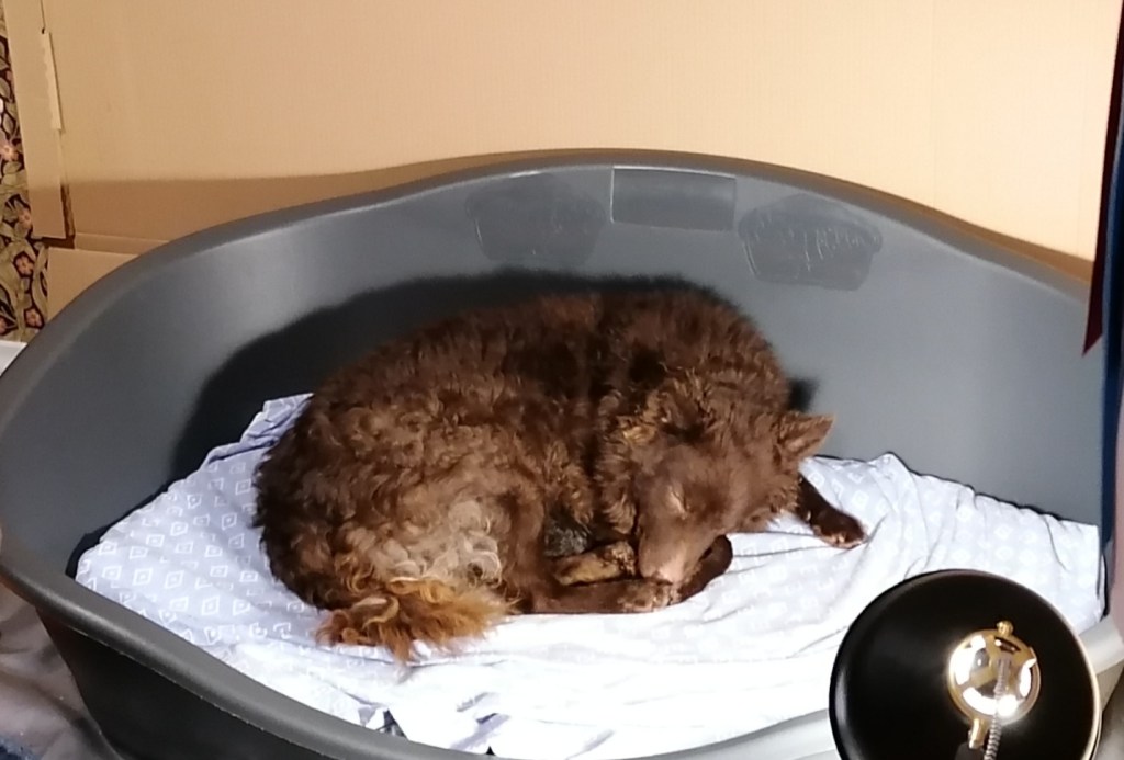 Polkan ainokainen syntyi perjantaina 4.12. lyhyen mutta dramaattisen synnytyksen päätteeksi. Ainoana pentuna poju viipyi synnytyskanavassa pitkään ja sen kuono pilkisti kyllä ulos, mutta livahti aina supistusten välissä takaisin piiloon. Pennusta ei saanut otetta, onneksi sain kuitenkin ruutattua liukuvoidetta pennun ja kanavan seinämien väliin. Tilanne oli hankala ja pitkittyessään olisi voinut johtaa pennun menehtymiseen. Loppujen lopuksi pentu kuitenkin luiskahti ulos vauhdilla Polkan loikatessa ulos pentulaatikosta. Siis loppu hyvin, kaikki hyvin!