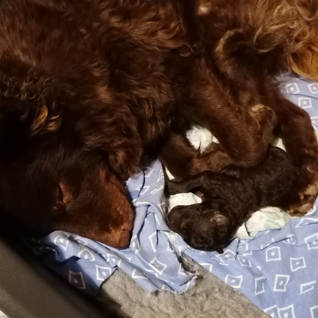 Tulokkaalla ei vielä ole nimeä, mutta se on ruskea uros, syntymäpaino 180 grammaa. Pentu on ainakin vielä väriltään hyvin tummanruskea ja sillä on rinnassa valkoinen merkki. Pienestä koostaan huolimatta se on osoittautunut hyvin sitkeäksi ja päättäväiseksi kaveriksi ja onkin kahdessa vuorokaudessa kasvattanut elopainoaan yli 40%! Pentulaatikolla elämä siis sujuu tyytyväisen tuhinan merkeissä. ❤